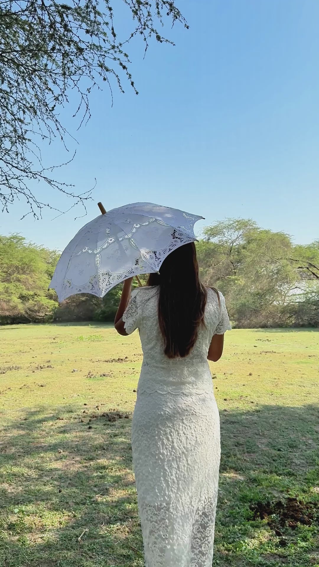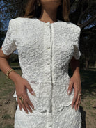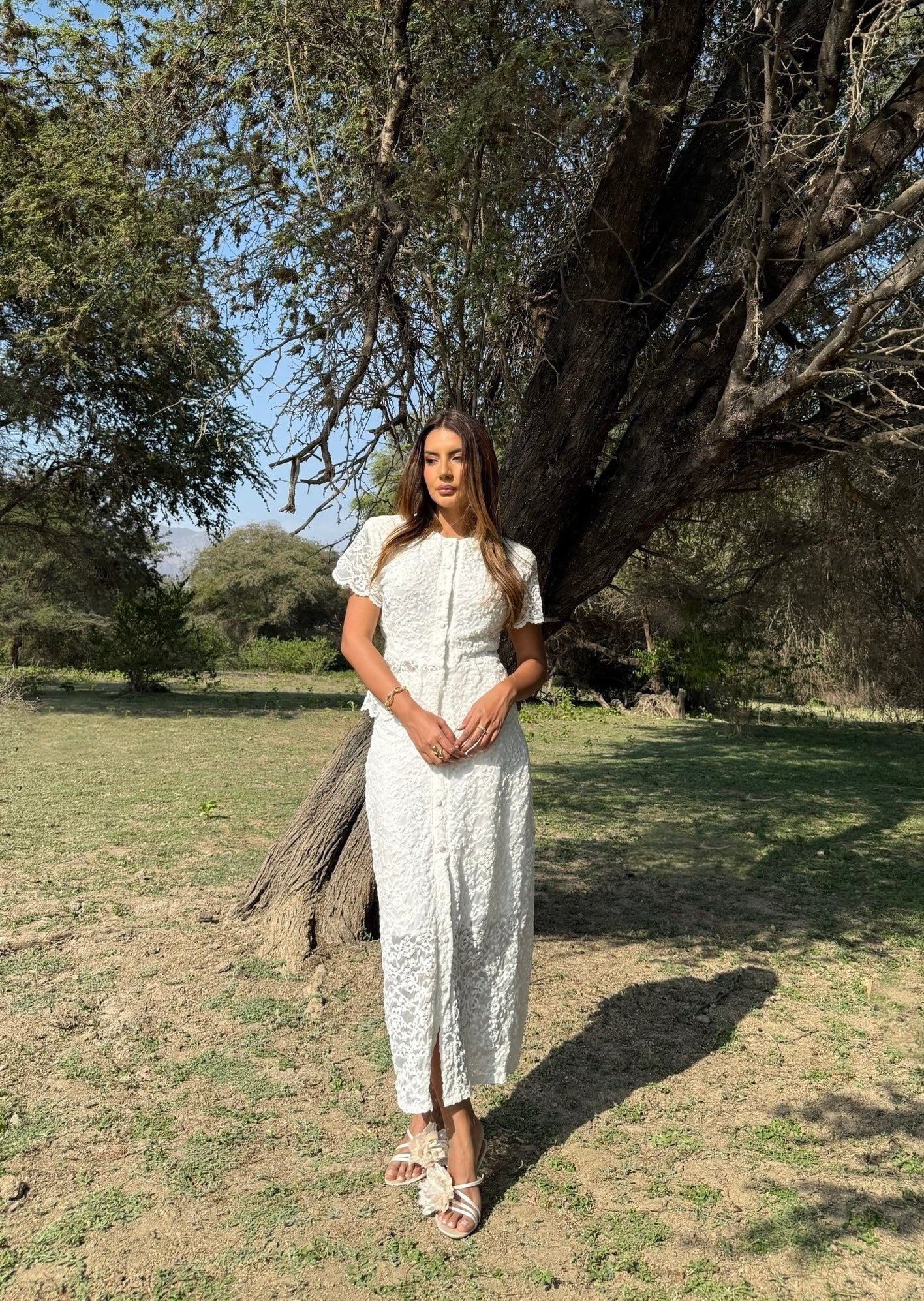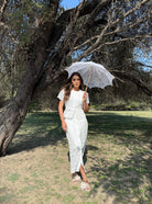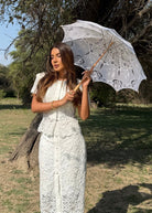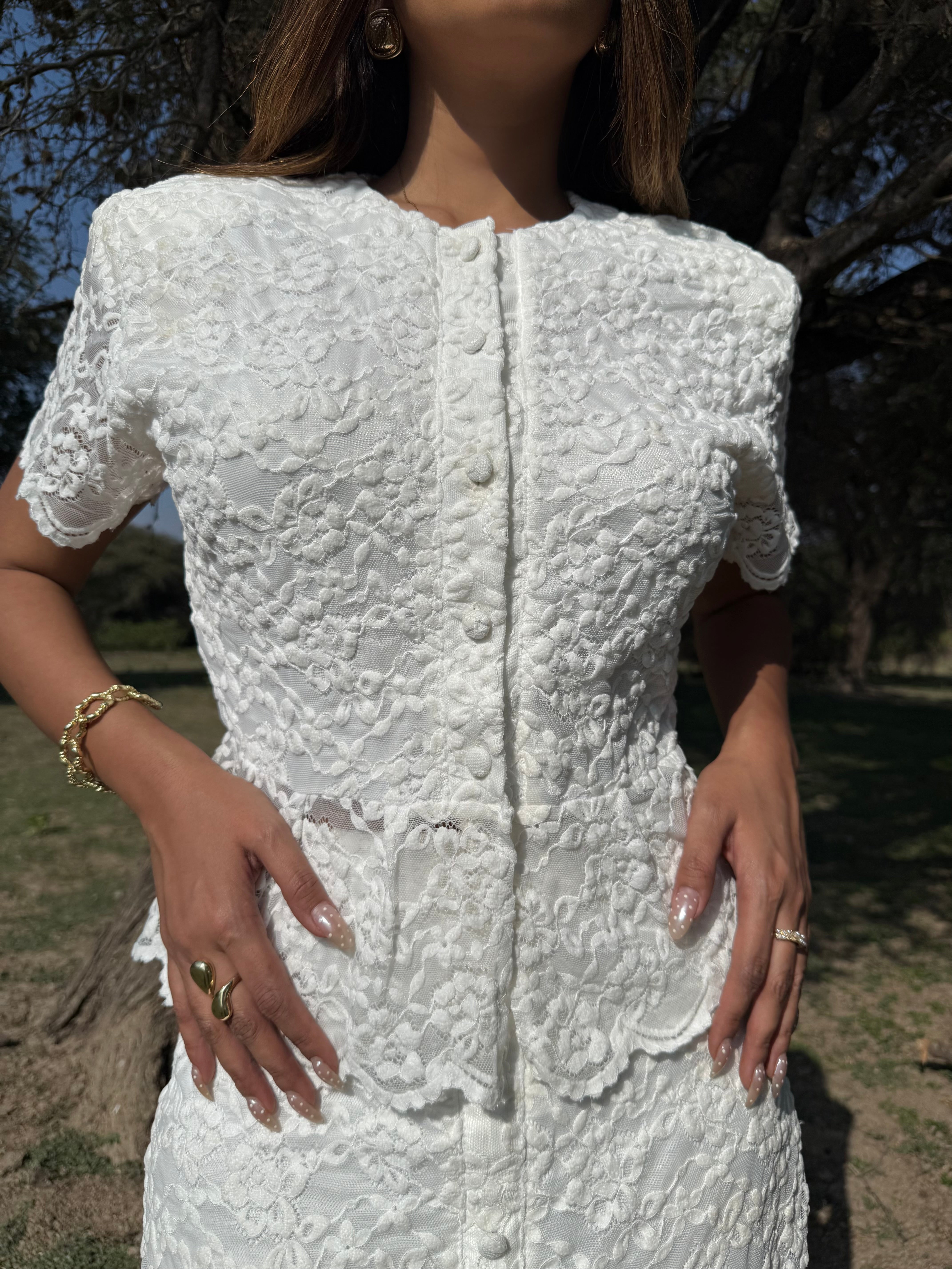 Su color blanco y el encaje detallado lo convierten en una opción versátil para eventos formales como boda civil, primera comunión o eventos al aire libre como un brunch.