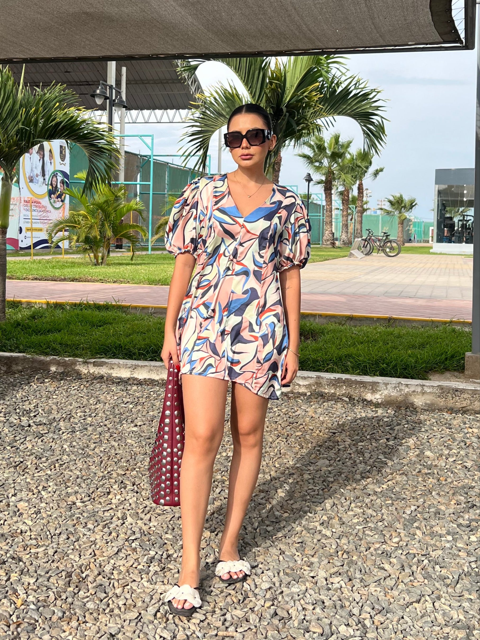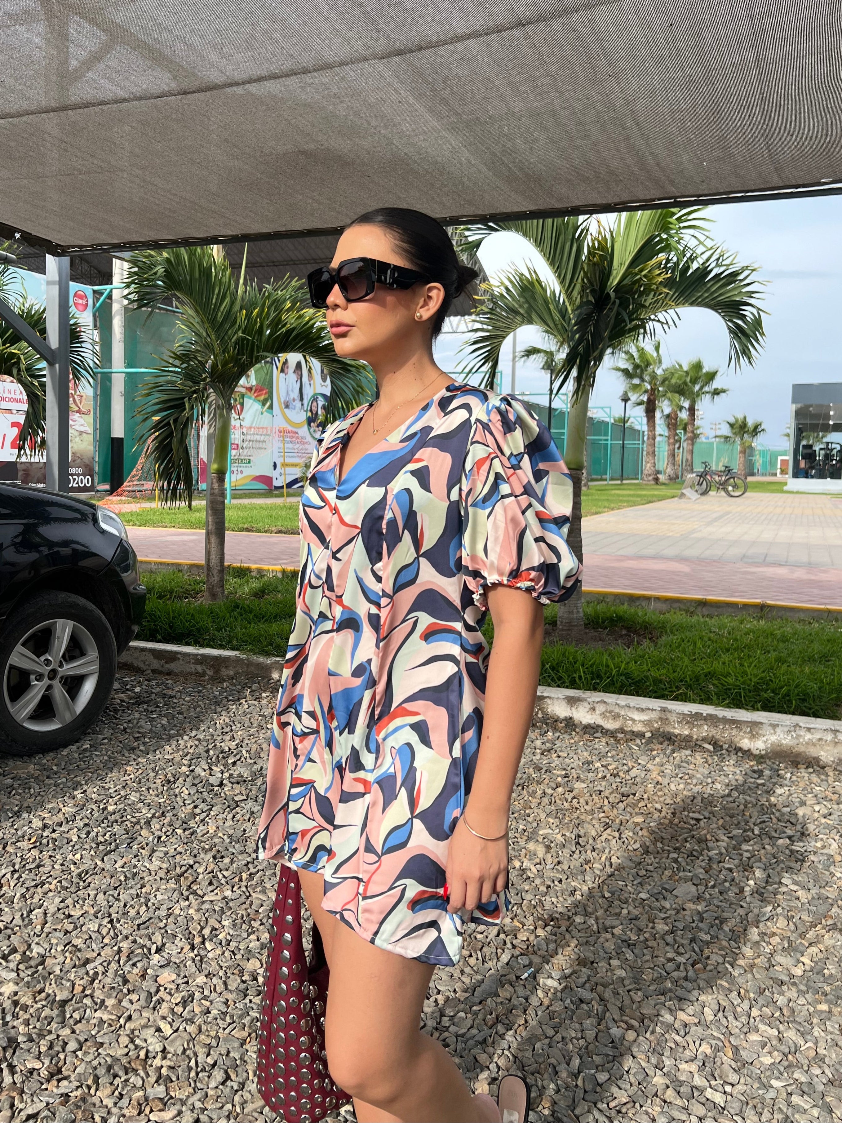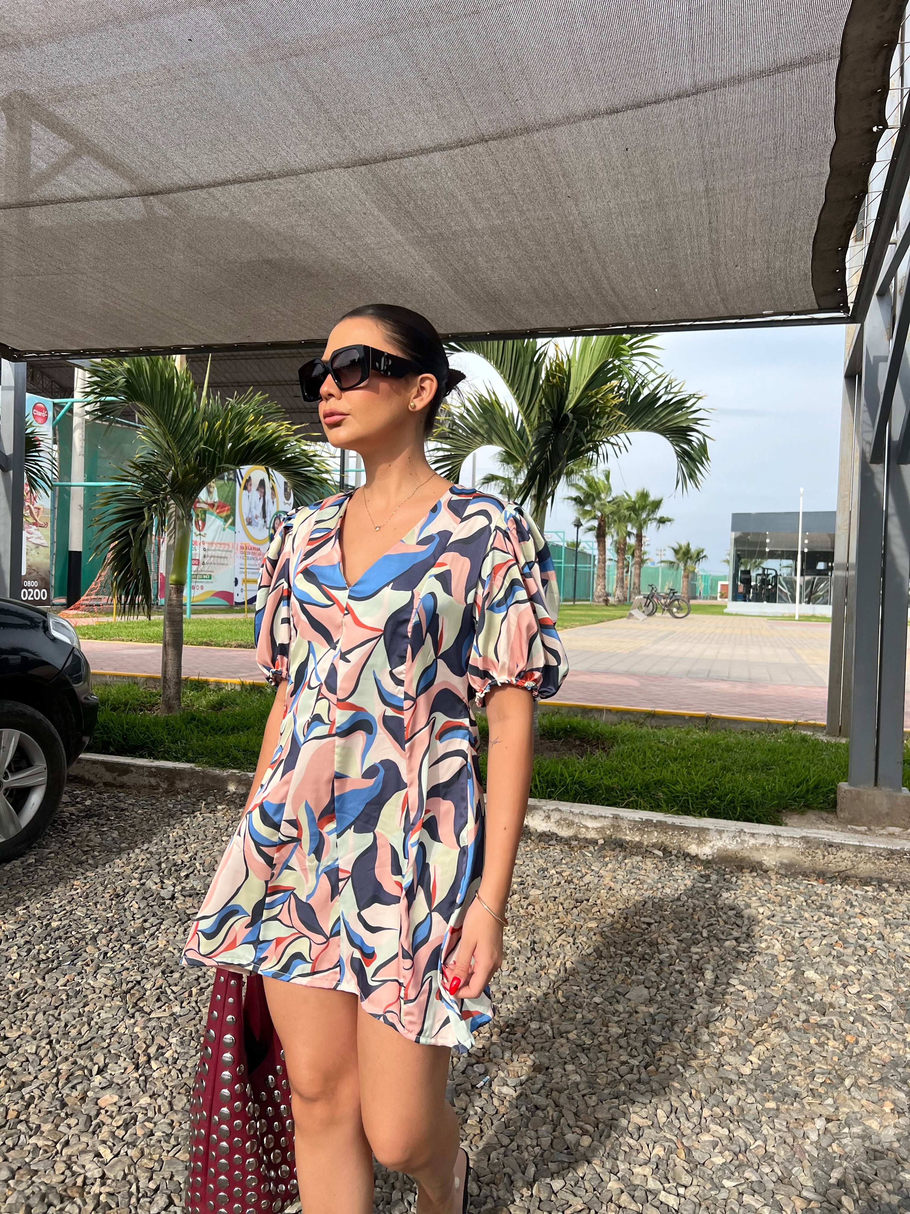 Juliette: vestido corto de estampado abstracto en tonos azul, coral, rosa y beige, creando un efecto moderno y sofisticado que evoca frescura y elegancia. Su diseño con mangas abullonadas y escote en V le aporta un toque romántico y femenino, ideal para realzar la silueta con sutileza.