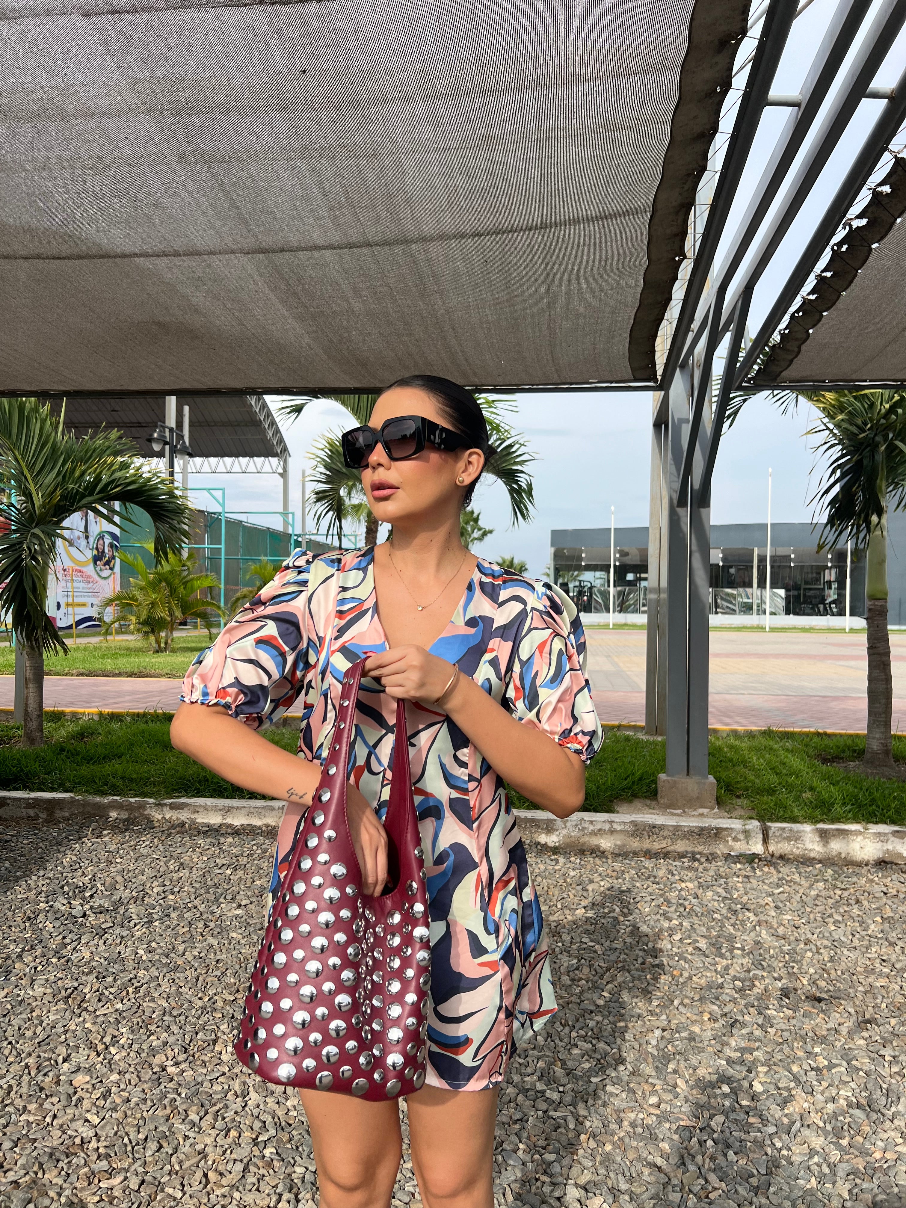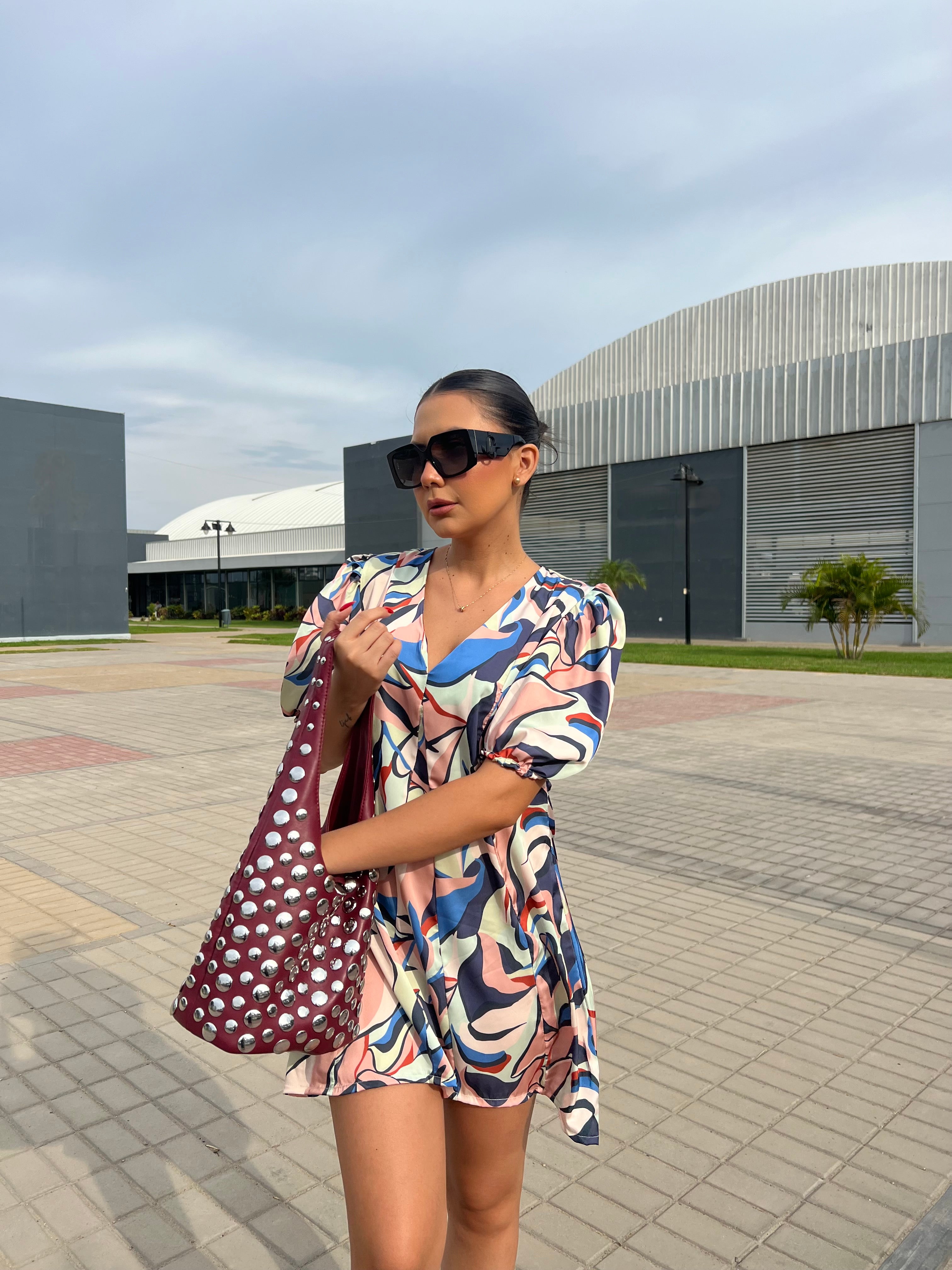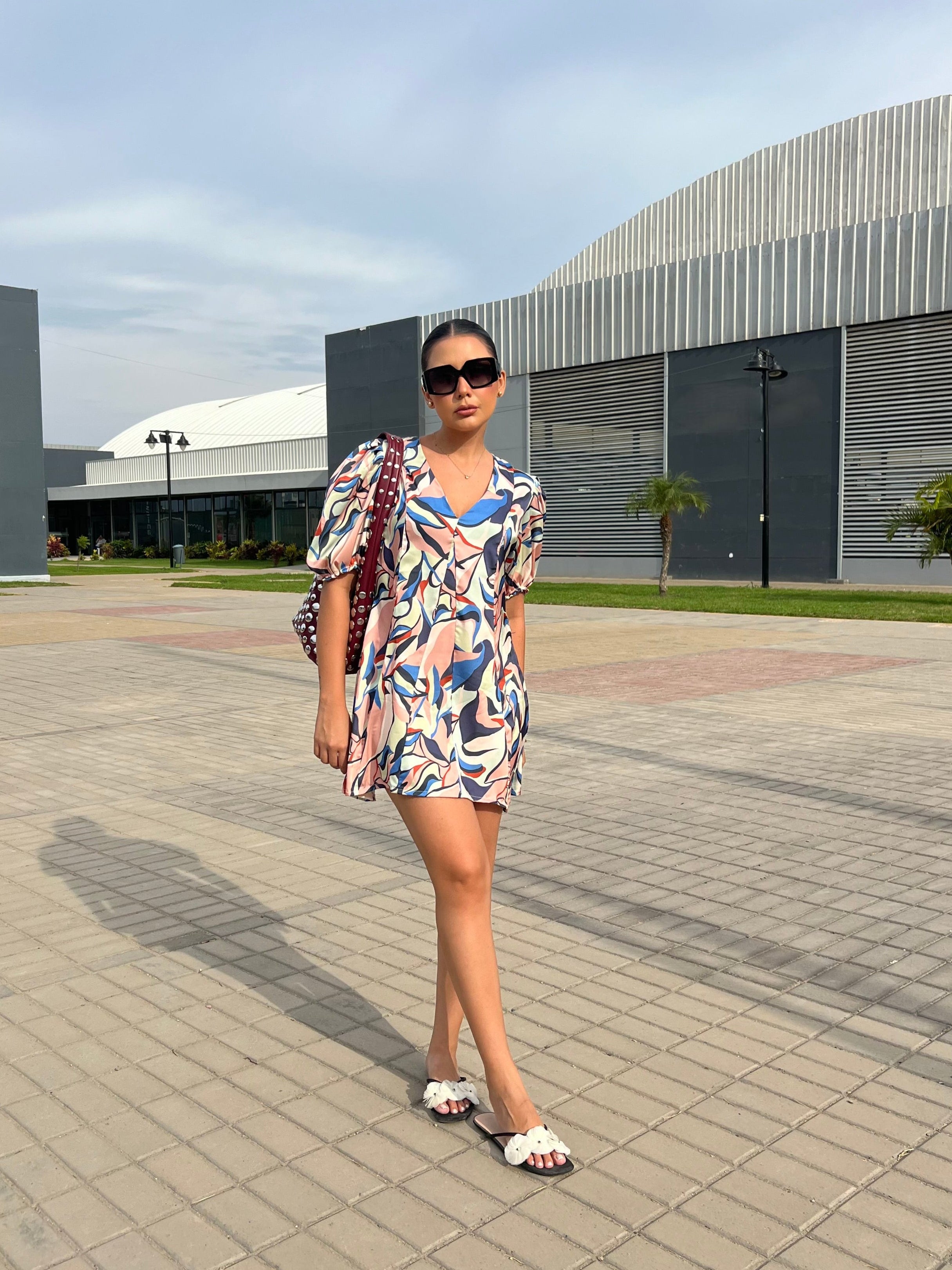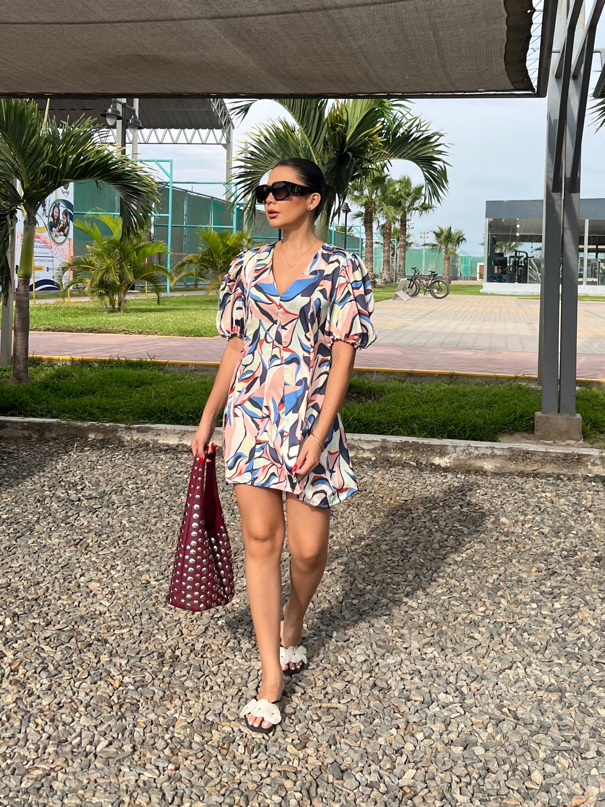 Juliette: vestido corto de estampado abstracto en tonos azul, coral, rosa y beige, creando un efecto moderno y sofisticado que evoca frescura y elegancia. Su diseño con mangas abullonadas y escote en V le aporta un toque romántico y femenino, ideal para realzar la silueta con sutileza.