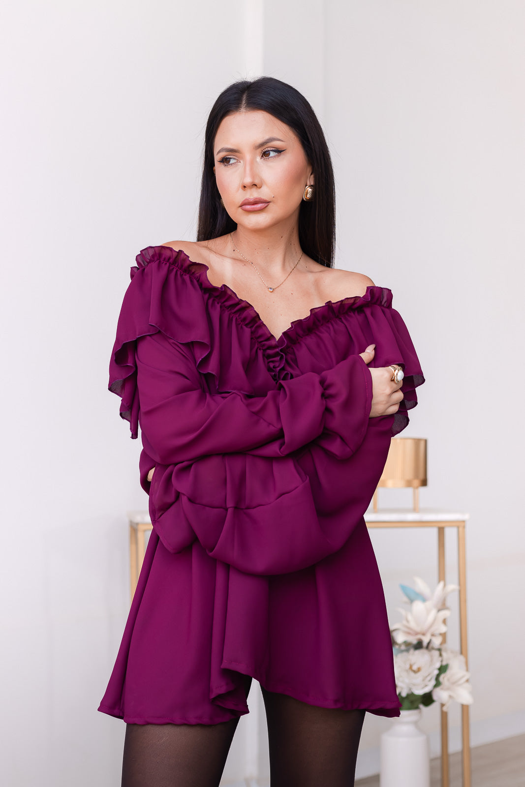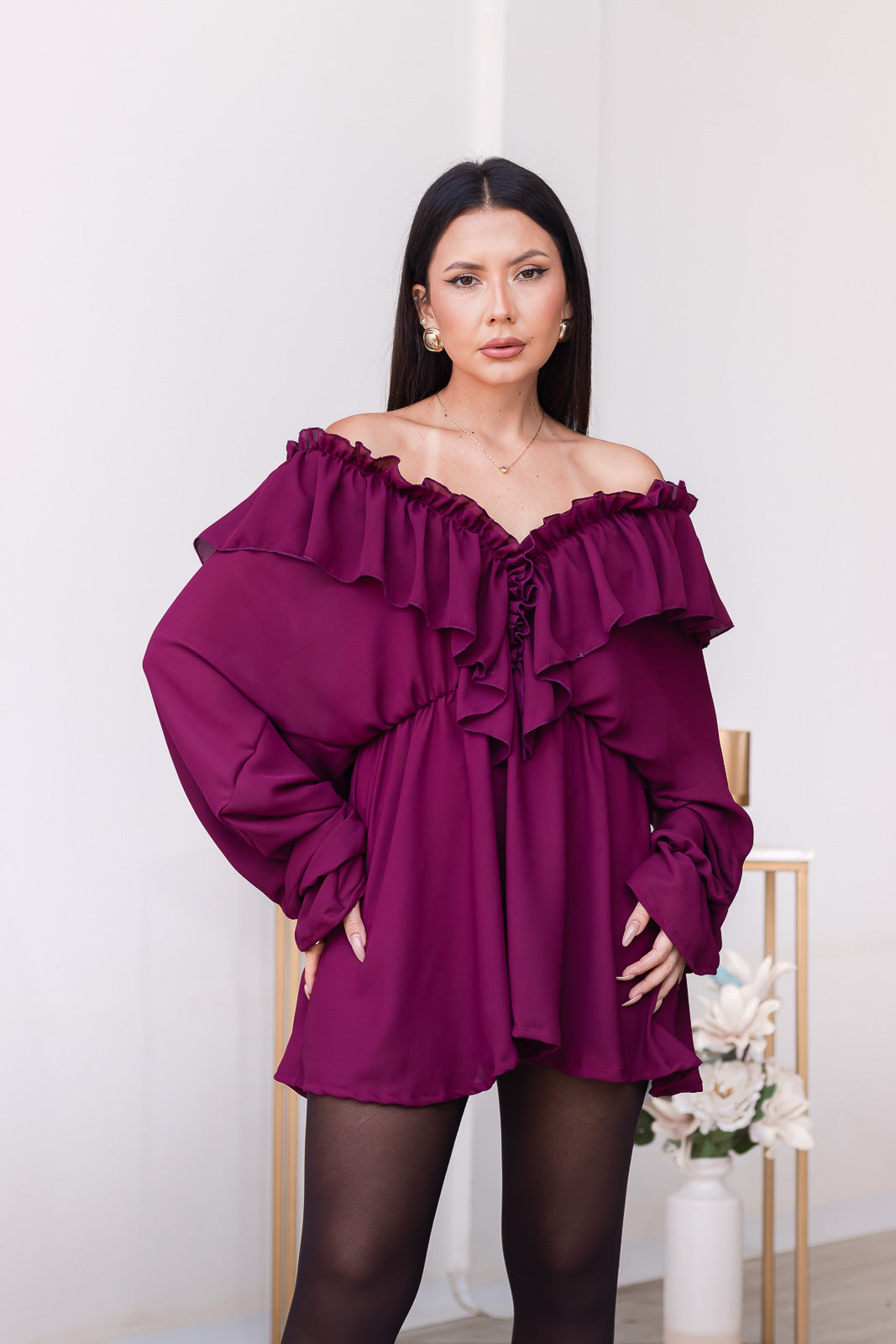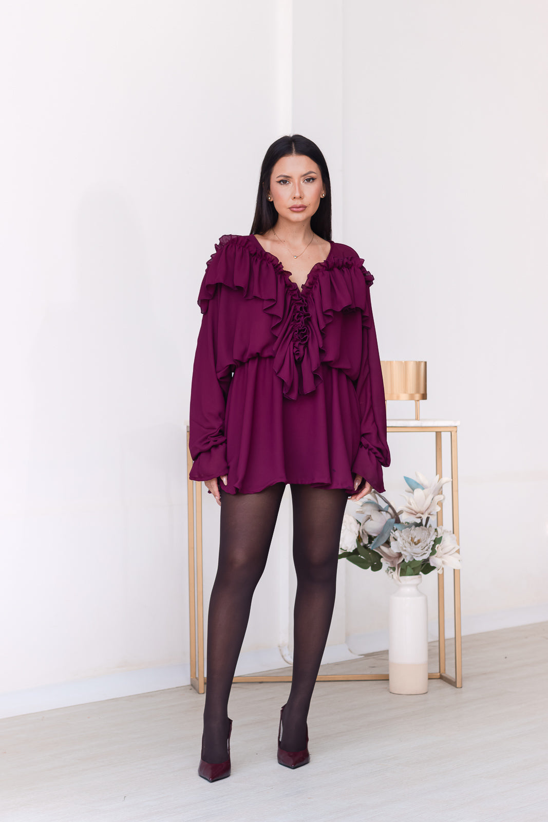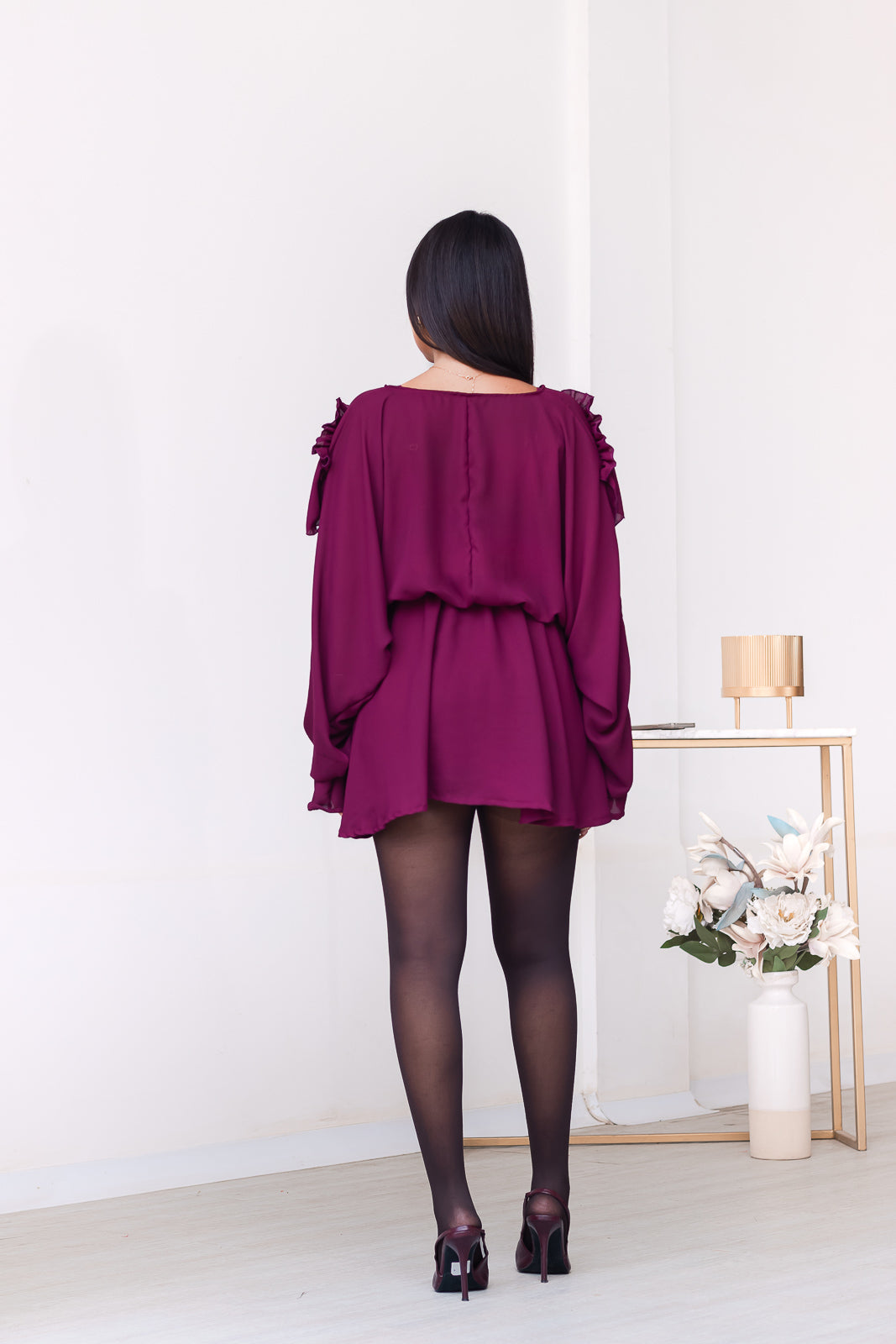 Leia vestido corto en un profundo tono burgundy de estilo boho. Diseño fluido con vuelos en el escote y mangas, evoca una elegancia que equilibra lo romántico con lo contemporáneo.