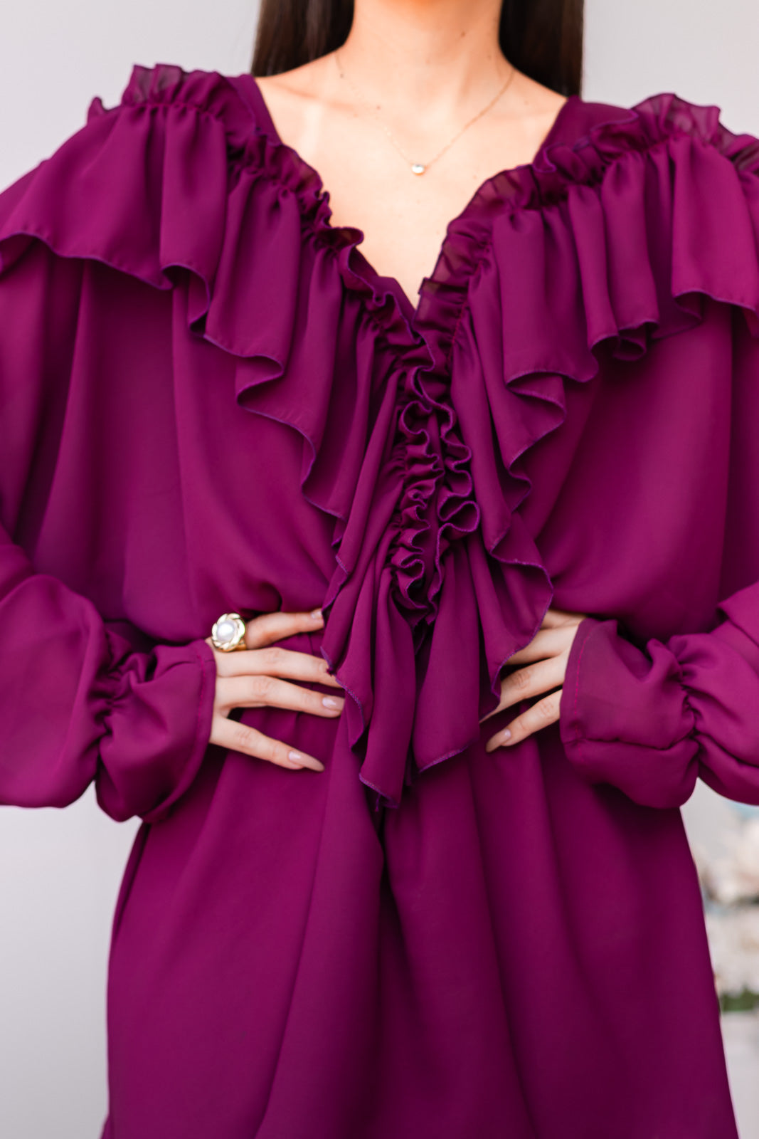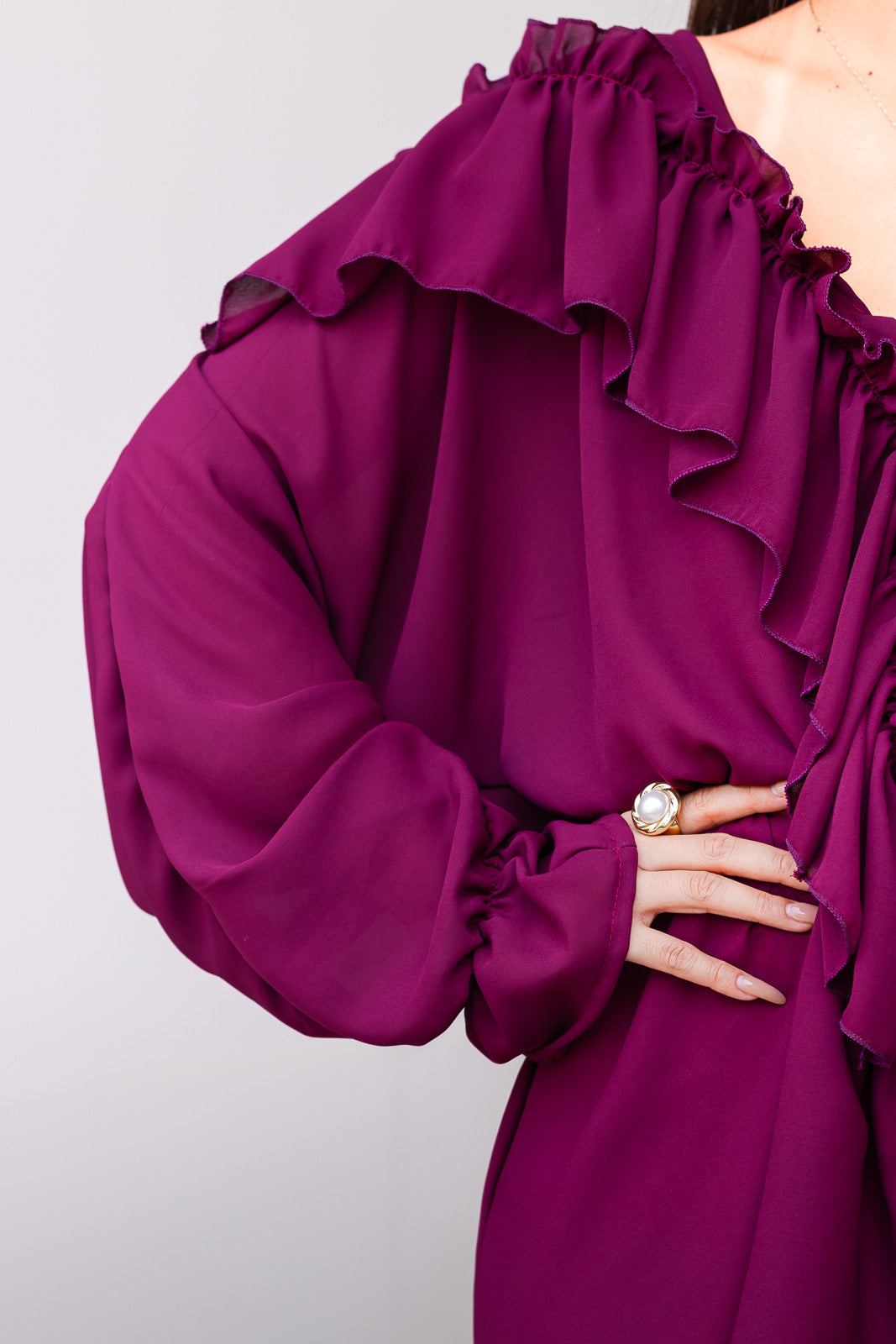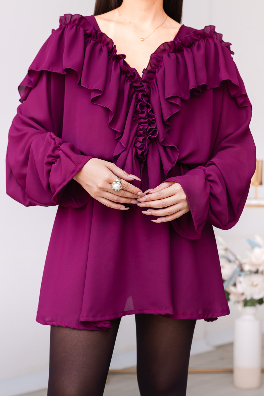 Confeccionado en material gasa de caída suave. Su silueta suelta estiliza la figura, mientras que el detalle de olanes al centro crea un punto de atención sutil y femenino. Perfecto para cenas especiales.