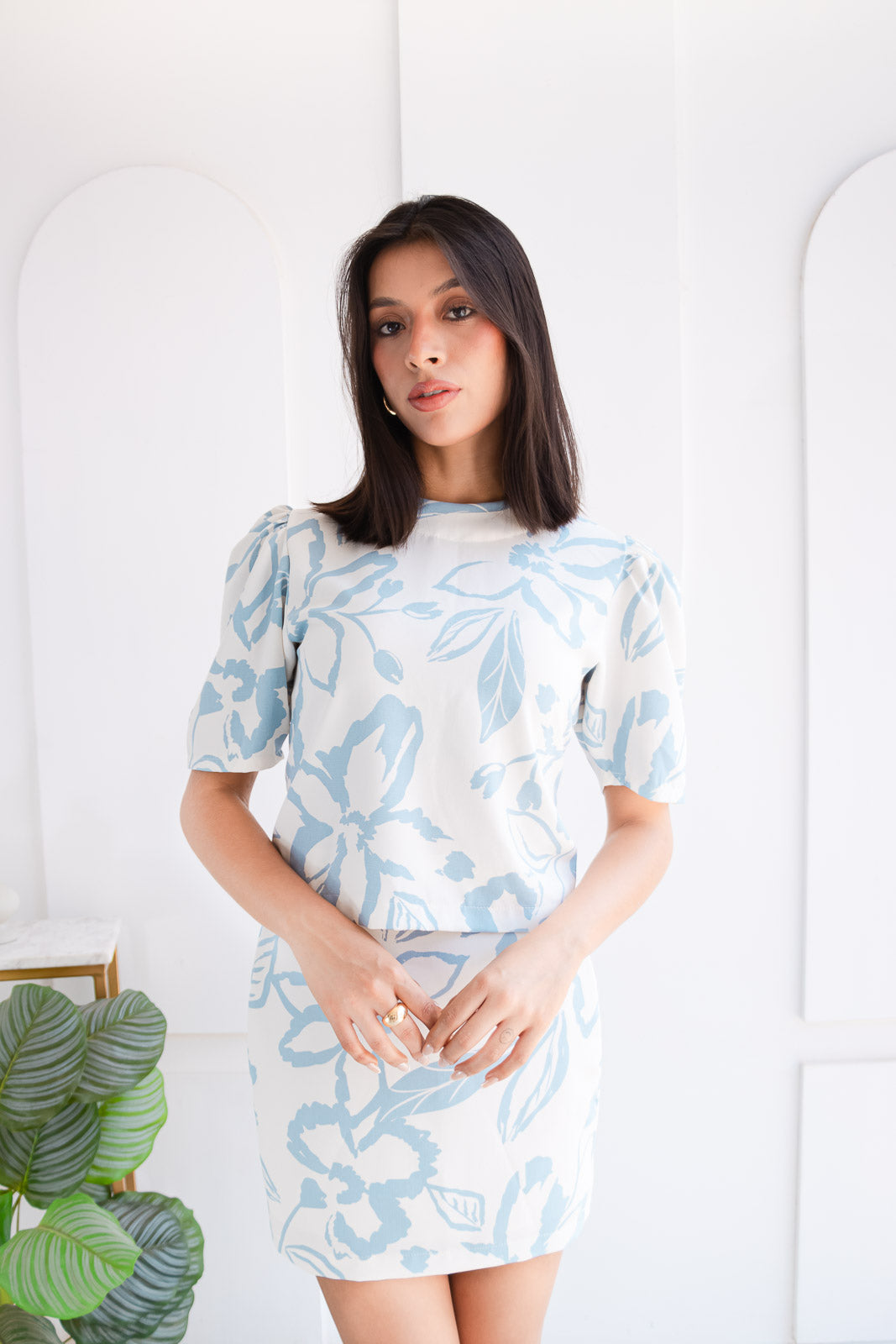 Falda corta con elástico en la parte de atrás, ambos en un delicado tono baby blue con estampado floral, este set es la mezcla perfecta entre feminidad y estilo. Ideal para eventos de día, brunches con amigas, citas especiales o incluso un look casual chic para la oficina.