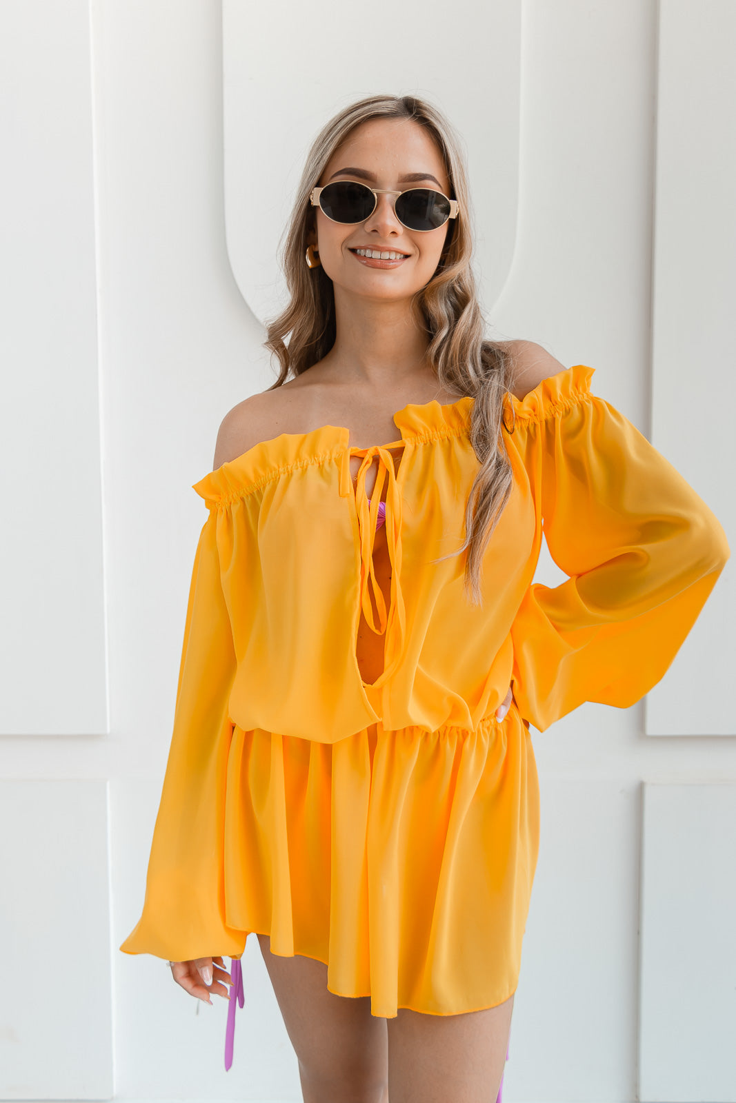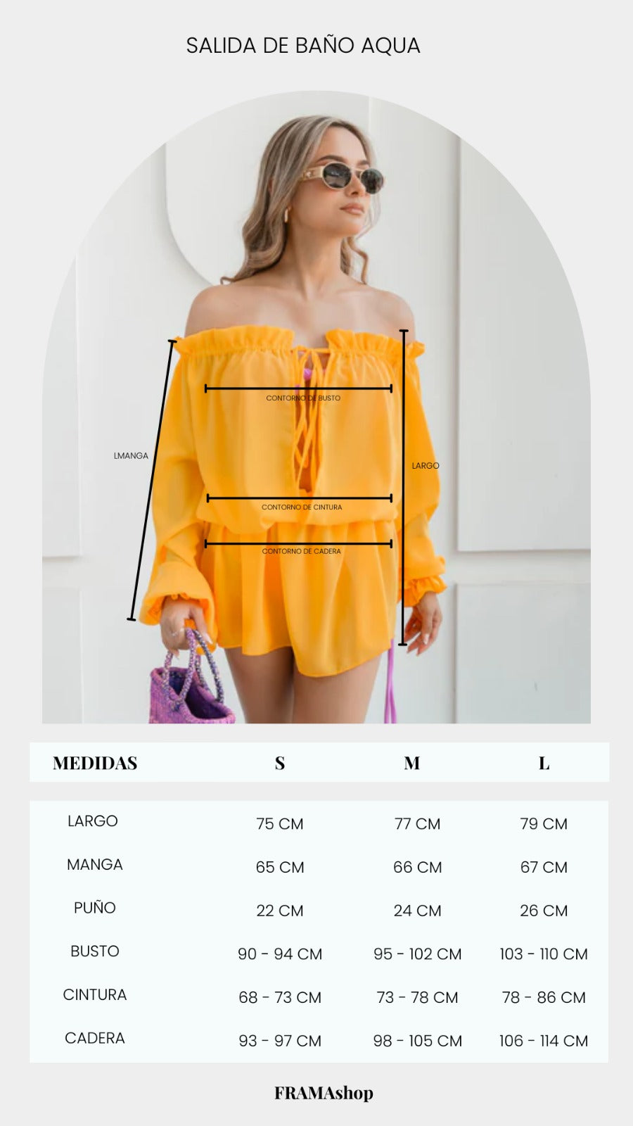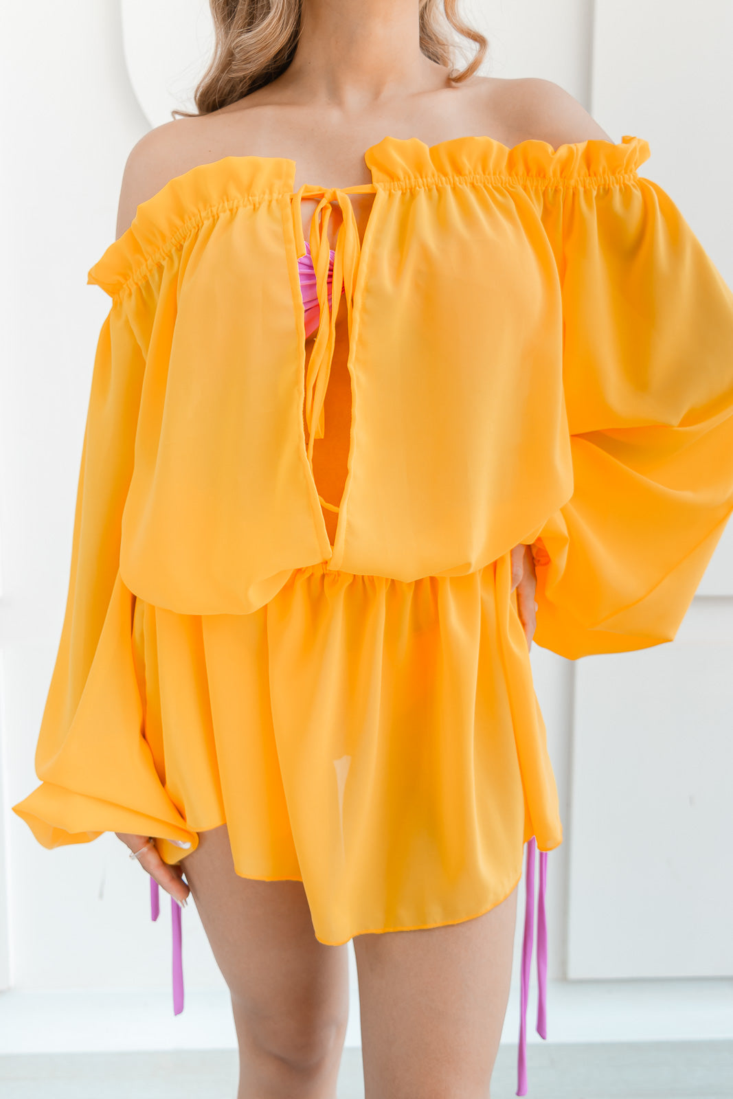 Amarás esta salida de baño porque es un diseño corto con detalle cut out en la parte delantera del pecho de color amarillo vibrante. El tono transmite alegría, energía y un espíritu atrevido, perfecto para los días de playa o piscina. Su diseño off - shoulder con mangas largas y corte holgado aporta frescura y comodidad, permitiéndote disfrutar del sol con estilo.