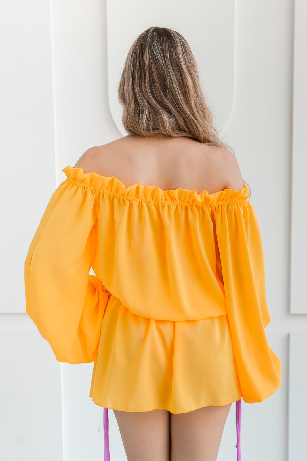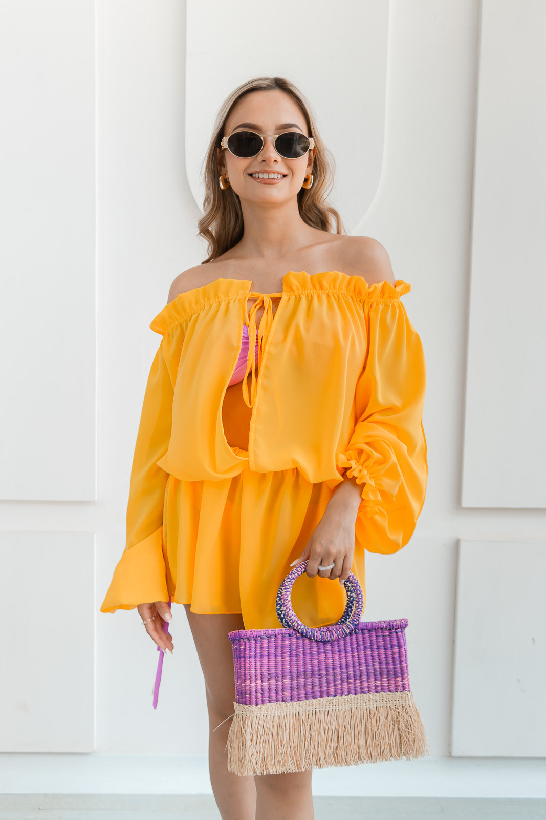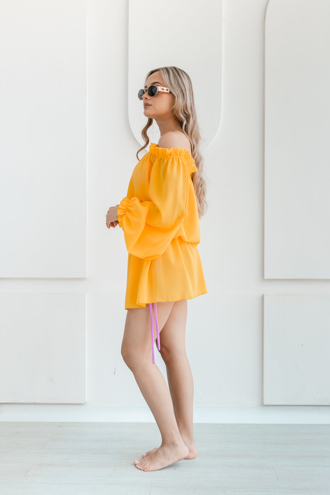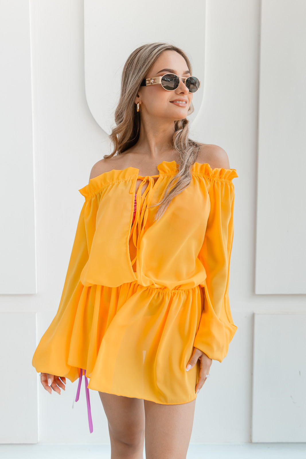 Amarás esta salida de baño porque es un diseño corto con detalle cut out en la parte delantera del pecho de color amarillo vibrante. El tono transmite alegría, energía y un espíritu atrevido, perfecto para los días de playa o piscina. Su diseño off - shoulder con mangas largas y corte holgado aporta frescura y comodidad, permitiéndote disfrutar del sol con estilo.