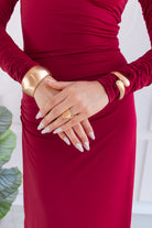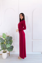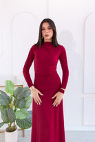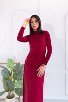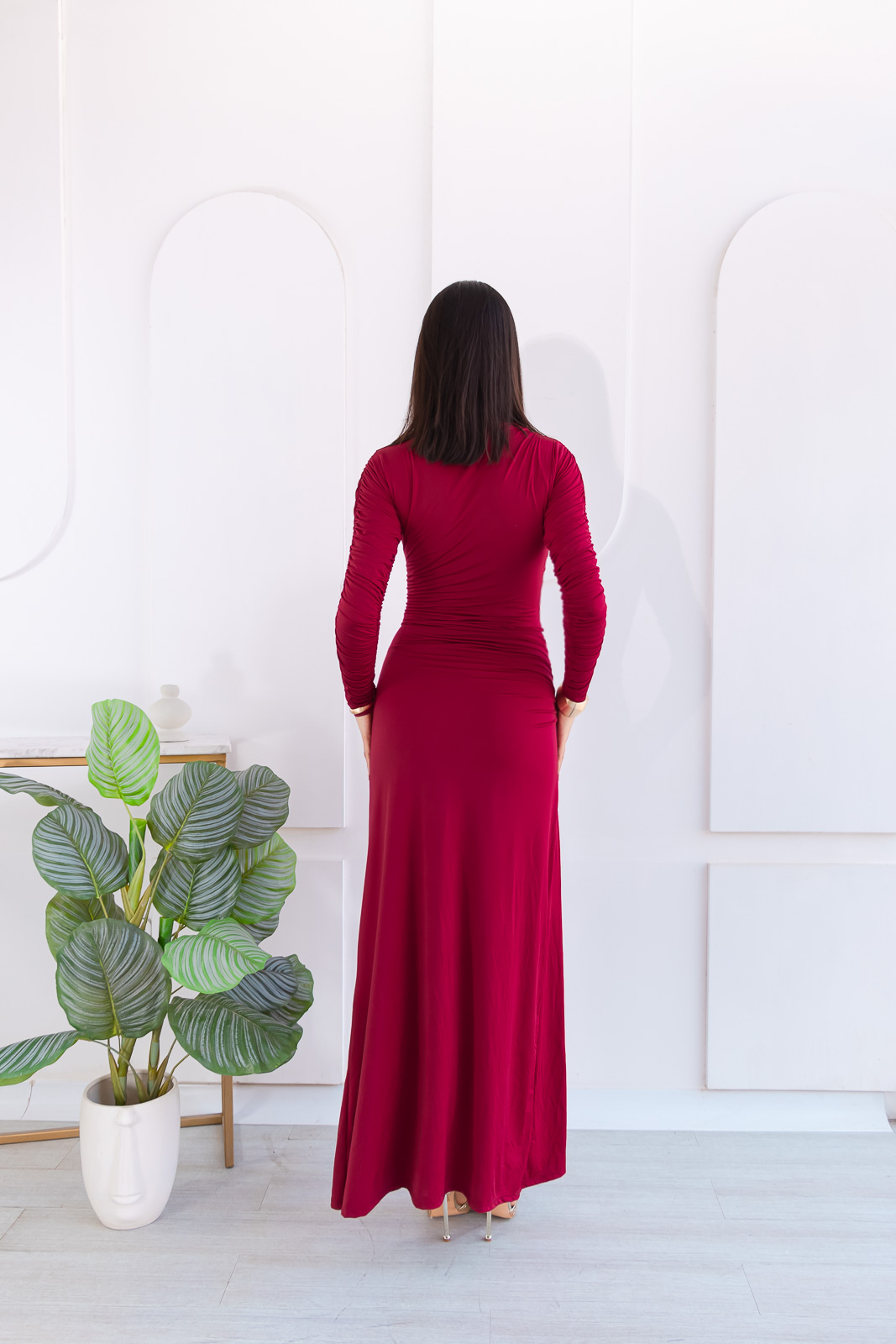 Vestido largo con mangas largas y detalle drapeado en la parte del cuello y caderas, elaborado de malla forrada en un color burgundy perfecto para esta temporada.